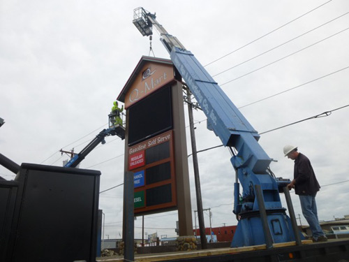 Installing a new sign. Take note of the red border along the peak of the sign’s top. That is actually LED.