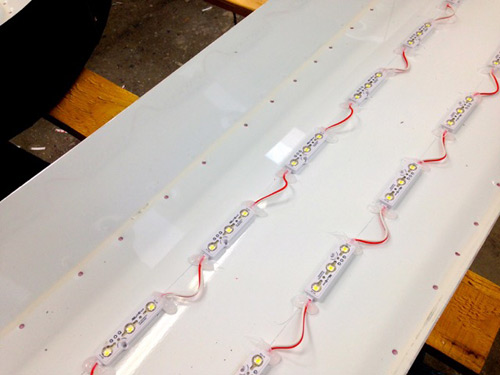 (Ken) “The most significant technology change has been with the color white. In the past it was hard for producers to get a good white LED. For one thing, white produces a lot of heat, so they used to have big aluminum heat sinks with these lights to offset that. Another disadvantage was that the light itself wasn’t really white. If you held it up against something that waswhite, the LED color looked more yellowish or greenish. In addition, the beam spread was narrow. Now there are better spectrums of white, the beam spread has improved, and the size of the bulbs has come way down. This is important because we use a lot of white in our signage designs.”