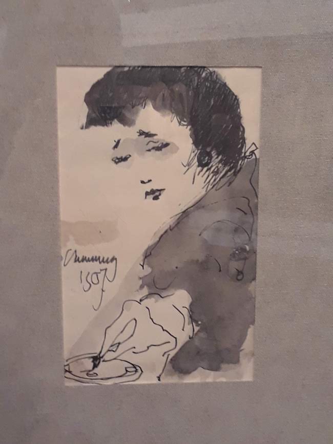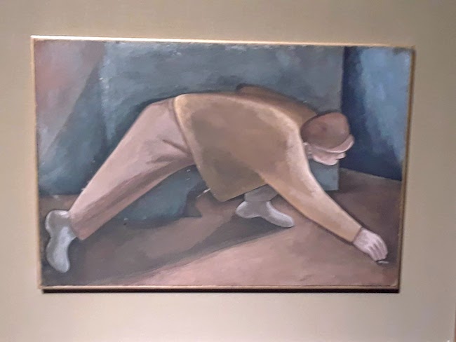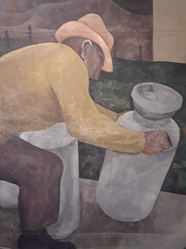 Two aspects of Cumming’s life and work set him apart: his book, “Sketchbook: A Memoir of the 30s and the Northwest School,” which tells stories of artistic practices in Seattle during the 1930s, and his figures.Cumming’s human figures during his first period of productivity and popularity (1930s and 1940s) are set apart because his use of lines, colors, and space. This is seen clearly in the figure moving the cans of milk in his 1941 mural of Skagit County agriculture. The sinuous lines that separate the figure from the background have a calligraphic quality, similar to those that can be found in Japanese art. The male figure also occupies the entirety of the space that he is allotted by the artist.