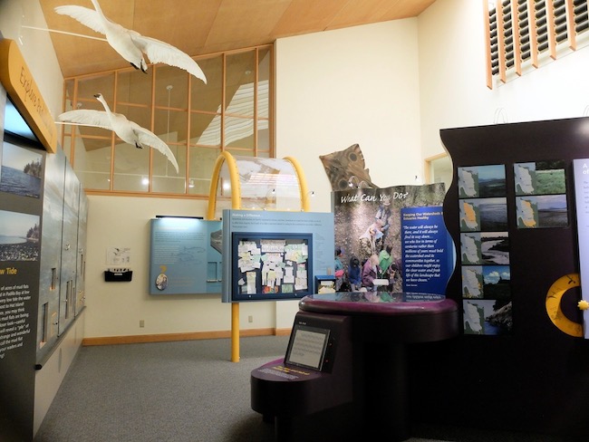 The Padilla Bay Reserve’s website states that it “…provides research and stewardship as well as education classes and professional trainings on a variety of environmental topics.” The venue from which it delivers all this is the Breazeale Interpretive Center, which includes an aquarium with exhibits. The Center is normally open the the public and free of charge — at least when we’re not in the midst of a global pandemic.