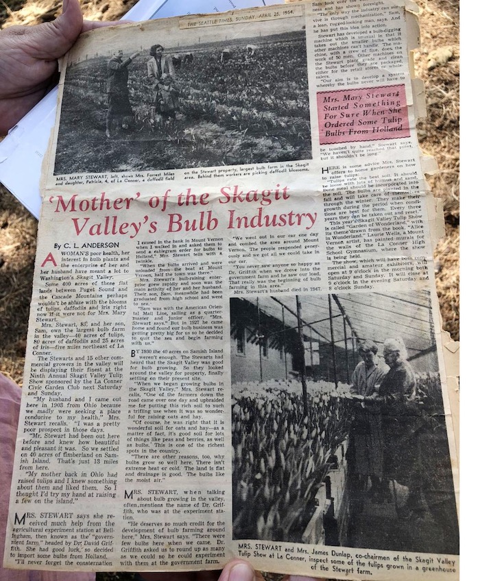 You may therefore be amazed to learn, as I recently did (thanks to the Skagit County Historical Museum), that the person who is generally credited with being the first to establish our local tulip industry was not a Dutch transplant, but a hearty local varietal who is fondly remembered as Mrs. Mary Stewart of Samish Island.