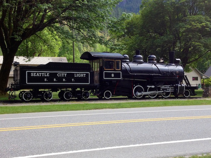 Driving past Nehalem, one landmark feature you can no more miss than the sheer rock cliffs towering over it is Old Number Six, a Baldwin steam locomotive that played an important role in the construction of the Skagit Project. It operated on Seattle City Lights’ Skagit River Railway, which ran 23 miles from Rockport to Newhalem, and later extended to Diablo. The railroad, under construction in 1920, was built to carry construction materials, equipment, and workers to the towns, dams, and powerhouses. Starting in 1924, it also transported tourists visiting the area. By 1940, the U.S. Forest Service had developed a passable road to Newhalem, but travel to the area by passenger car was not common until after World War II when the road was improved as part of the state highway system. The locomotive operated until the railroad was removed in 1954.