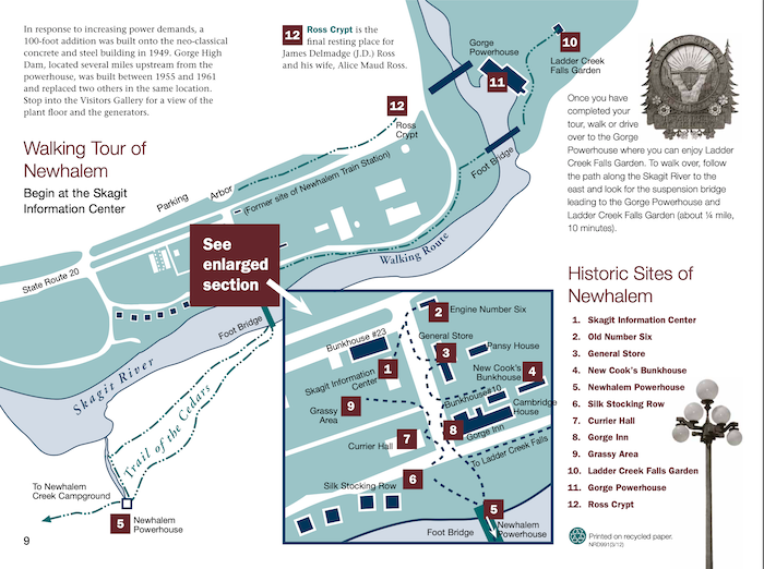 Just a few miles down the road from the Visitors Center and we arrive at Newhalem — a place to snare goats and enjoy an al fresco lunch at one of the picnic tables located throughout the town. Fortified and attired, based on the season, we’re ready to follow in the footsteps of citizens who visited Newhalem in the 1930s as we walk back in time through the town and its nearby hydroelectric plants, Gorge and Newhalem. Although features have changed, the town retains its original layout as well as many of the historic structures from the pre-war years. As you stroll through the town today, imagine what it must have been like to reach this remote community by train, when the wonders of electricity and hydropower were still brand new.