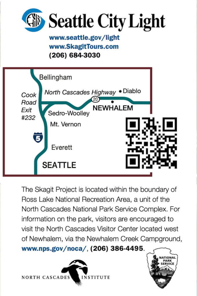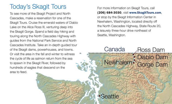Credits: Most of the information in this article was taken from online resources available through Seattle City Light and Skagit Tours. For info on how best to plan your tourist activities during The Great Pandemic, contact these organizations through the phone numbers and web addresses above.