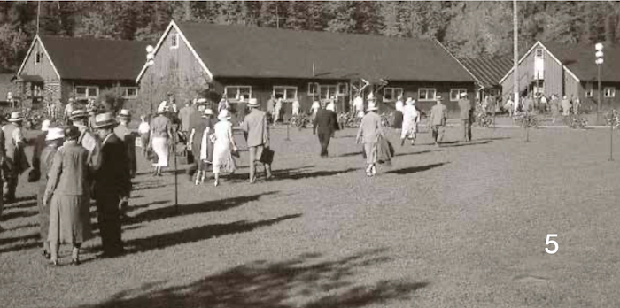 Note: for another perspective on Silk Stocking Row, stroll the grassy area just behind the Information Center. This area once had dozens of tent cabins and wood-frame houses for use by City Light workers. The rows of trees are reminders of the residential roads and paths that existed in this section of town. Garages for the Silk Stocking Row houses were located near the highway and were constructed in 1939 when the road to Newhalem was completed and made it possible for employees to have cars. Made of corrugated iron and too small for today’s cars, the garages were torn down in 2010. They are being replaced with newer structures to serve the needs of current Newhalem residents and blend into the area.
