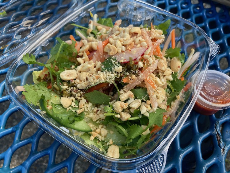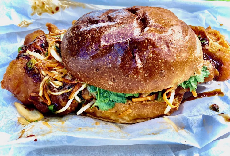 But I’ve learned through sufficient life experience that fate has an even handed way of dealing with adversity. For every agony of defeat, there is after all the thrill of victory — and vice versa. Even as Sarkall’s was shutting down its deep fryers, a new restaurant was opening up (pandemic notwithstanding) just a few blocks away: The Fairhaven. And although its menu does’t include a bahn mi sandwich, it does include a mighty fine bahn mi salad and a Korean Fried Chicken Sandwich that will knock you right off your Birkenstocks. The menu description reads, “Batter fried chicken topped w/ sweet & tangy bulgogi sauce, kimchi slaw, cilantro & scallion (available grilled)”. Frankly, you had me at “sweet & tangy bulgogi sauce.”