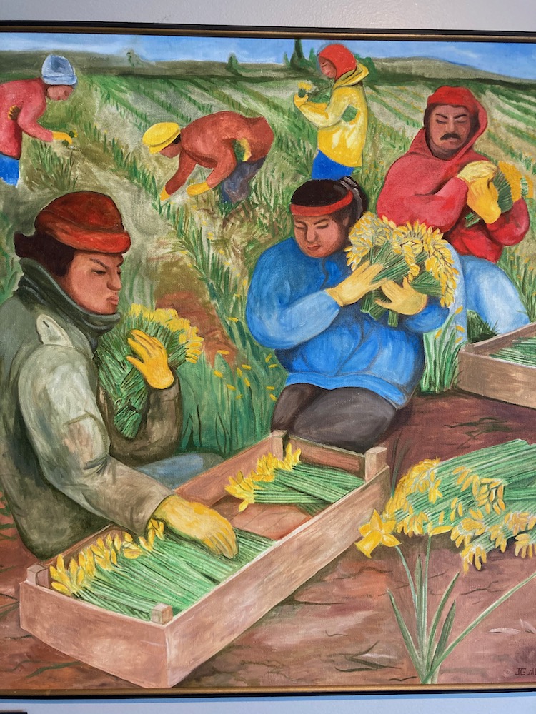 At the time of his death in 1994, Jesus was working on a pencil schematic on repurposed canvas for a mural that would be painted over a previous work. It would depict the annual Skagit Valley bulb harvest, with workers and equipment cultivating the fields and planting the bulbs in late fall. The daffodil and tulip bulbs bloom in spring and are carefully picked and packed by the farmworkers. The Skagit County Historical Museum display of this work-in-progress notes, “This painting stands as testimony to Guillén’s courage and perseverance to honor his artistic practice and respect for his fellow farm workers until the last days of his life here in the Skagit Valley.”