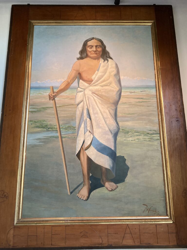 The photo also brought back the memory of a portrait of Chief Seattle that I had seen at the Burke Museum, painted by the artist Ralph Coombs in 1894. Draped in a garment that might be described as a blanket or robe, this great leader of the Puget Sound Suquamish and Duwamish peoples (whose Lushootseed name was translated as “Sealth” or “Seattle” by the non-native settlers who populated the area) displayed the gravitas of a toga-clad leader of the Roman Senate — who would hardly be described as wearing “blankets.”