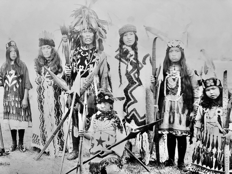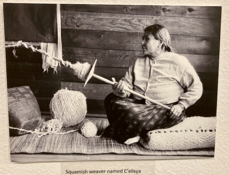 While marveling at Dan’s exhibit, which deserves its own “Tales of the Magic Skagit” episode (that’s on the editorial calendar as well, if I can just keep from being distracted by bright and shiny literary objects), I was intrigued not only by the art, but with the story the artist told of his ancestors and culture. I was especially drawn to a photograph of his great-great grandparents, Frank Hillaire and Agnes Haumea, and their children that was taken around 1915 and is now a part of the Library of Congress. In addition to their beauty and presence, what amazed me was the artistry of their clothing — especially the woven blankets, although “blanket” seems far too prosaic a description for the garments worn in Dan Friday’s family photo from the early 20th century.