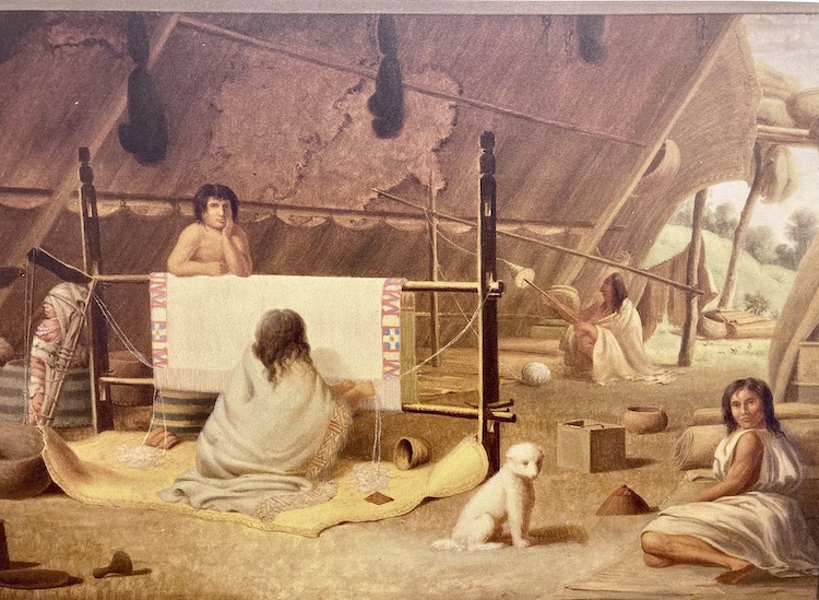 Perhaps the most important European documentation of the importance of the Woolly Dogs to Salish culture is found in artist Paul Kane’s painting, “A Woman Weaving a Blanket” done between 1849 and 1856, which shows the advanced, sophisticated Salish weaving operation, featuring the white Woolly Dogs of Guemes Island.