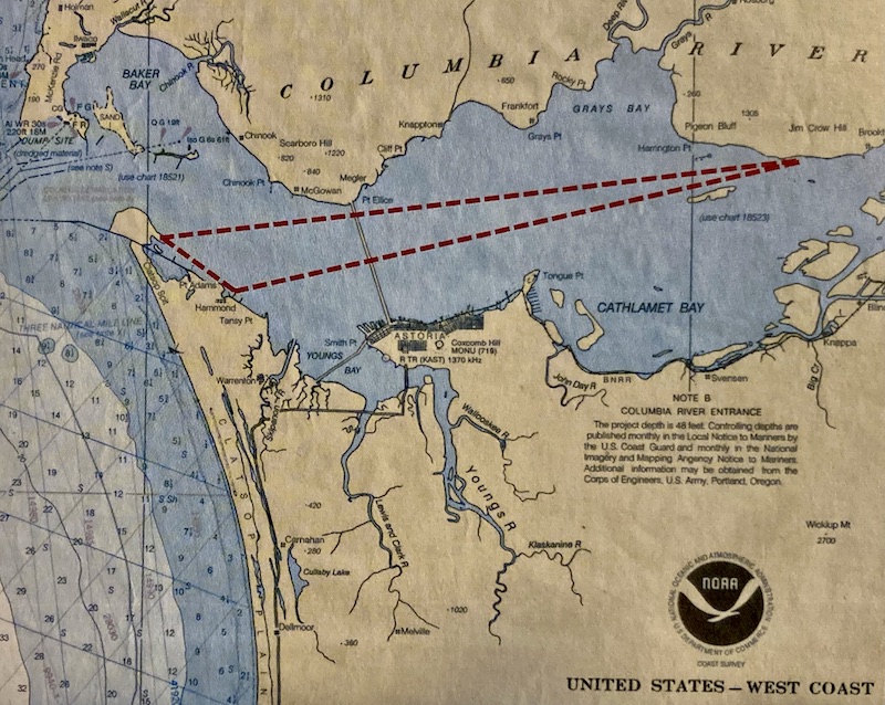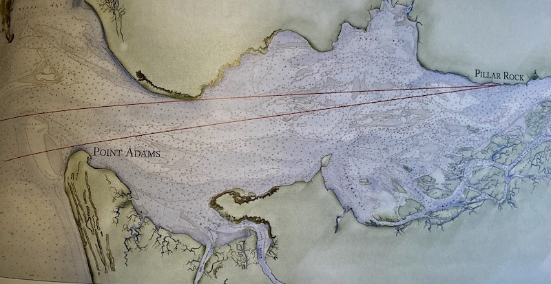 That little footnote made a compelling case for believing that William Clark had been swept up in a combination of misidentification and exuberance — one that can easily be affirmed by taking a simple line of sight from the point on the Washington side of the river where the Corps was camped and superimposing it over a map of the Columbia River’s mouth. You can’t see the sea. The conventional wisdom regarding what Clark actually saw, since it clearly wasn’t the Pacific, is that it was the Columbia River Estuary, between Altoona and Grays Bay.