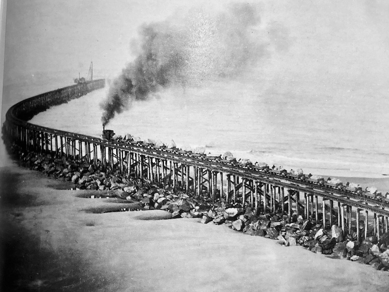 “Over the next decade, between 1885 and 1895,” Ziak writes, “millions of tons of rock were placed in the ocean. Eventually the rock settled and its level rose above the waves. The construction of this ‘South Jetty’ was the largest pubic works project in the history of the United States.”