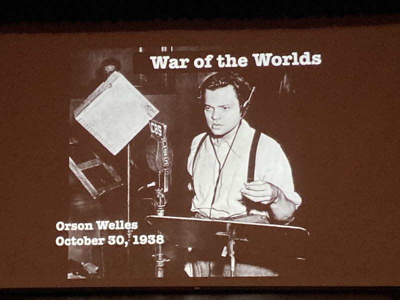 “People had two programming choices back then: CBS and NBC. One of them played music and the other was broadcasting the Mercury Theater, which featured the popular radio personality Orson Wells (who would go on to greater fame as a Hollywood actor and film director). Wells was doing a radio dramatization of the H.G. Wells science fiction class, War of the Worlds, but he was doing it as though it was a live newscast. If listeners were switching back and forth between the two broadcast stations, they might have missed the disclaimer that the events Wells was so dramatically relating were fictional. As it was, a lot of Americans actually believed we were under attack by Martians.”