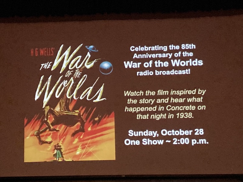 A week after the commotion, said Val, the editor of The Concrete Herald wrote an article claiming that nobody in town had really been all that concerned about an alien invasion, but in what might well be the only known mention of Concrete, WA on the front page of the New York Times, there appeared an article about a “small town in Washington state” that was in a panic over Orson Wells’ October 30, 1938 broadcast. In celebration of its town’s endearing gullibility, the Concrete Theatre pays an annual cinematic tribute to War of the Worlds with an old black & white film adaptation of the H.G. Wells classic, along with portions of the celebrated radio broadcast that snookered a lot more folks than just the good citizens of Concrete…although to far less acclaim than the front page of the Times.