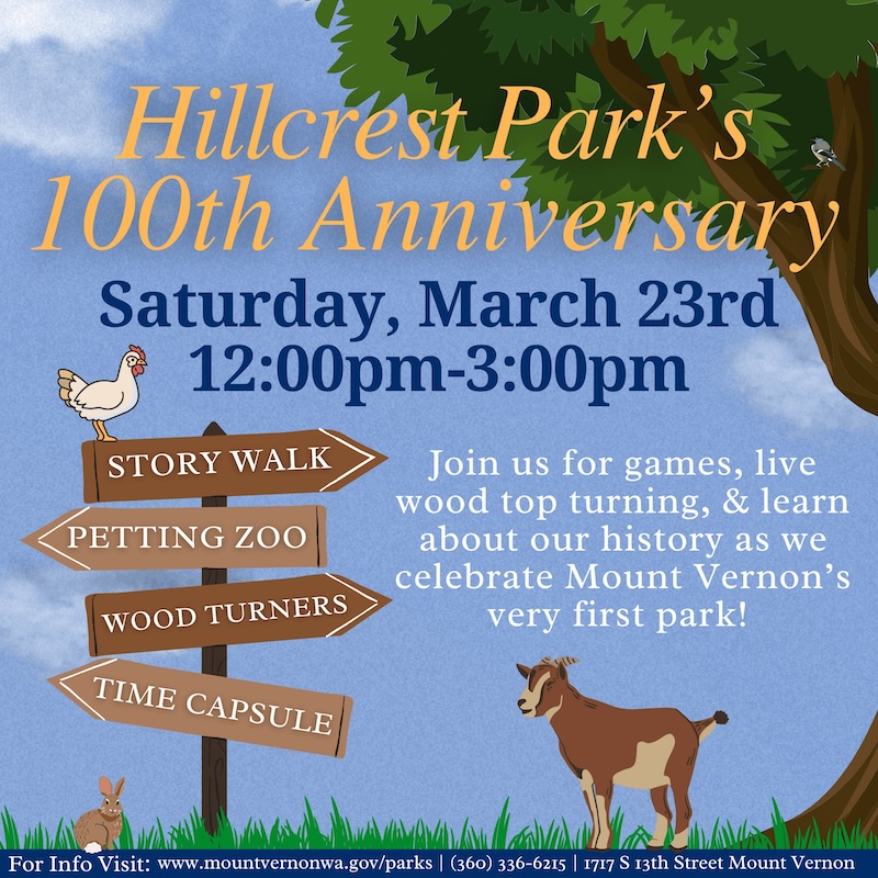 On March 19, 2024, Hillcrest Park turned a century old. On Saturday, March 23, the City of Mount Vernon is throwing a birthday bash in its honor, courtesy of the city’s Parks & Enrichment Services Department. At a 12pm – 3pm event that is free to the public, festivities will include “a Petting Zoo, live turning of Wood Tops by the Woodturners Association, games and crafts of the last century, and a Time Capsule Ceremony with celebratory cake and refreshments.” I can’t wait to see what that cake looks like!