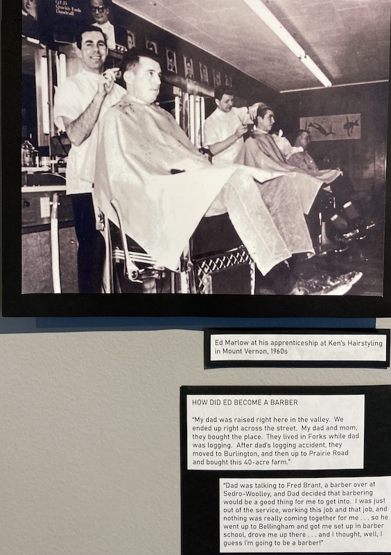 Born in 1937 and raised in Forks, Washington, Ed’s upbringing was a blend of nature and community. His family moved to Burlington after his father suffered a serious injury in a logging accident. Later, they relocated to a farm in Sedro-Woolley where Ed pursued his passion for barbering. After serving in the military he obtained a barber’s certificate in 1962 and opened a unique shop where customers could buy their fishing poles and hunting licenses, get a haircut, and grab a cup of coffee all in one stop. The nearby loggers would often come into the shop to “talk logging,” which was a significant industry in the area. In the exhibit there are many photos from Ed’s family that speak to the importance of logging and the impact it had on his barber shop.
