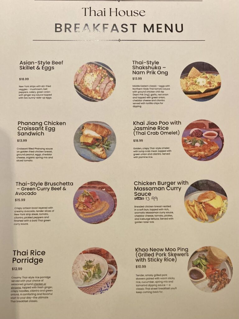 I’ve included a photo of the Thai House Breakfast Menu, which my wife and I plan to work our way through over the course of the year. We’ve already decided on the Khao Neow Moo Ping (Grilled Pork Skewers with Sticky Rice), and I’m leaning heavily towards the Thai-Style Shakshuka — Nam Prik Ong, which offers up an intriguing interpretation of a Middle Eastern classic with a Thai ground chicken chili dip. I’m thinking this might also be the Thai equivalent of the Mexican dish chilaquiles. I’ll keep you posted on that.