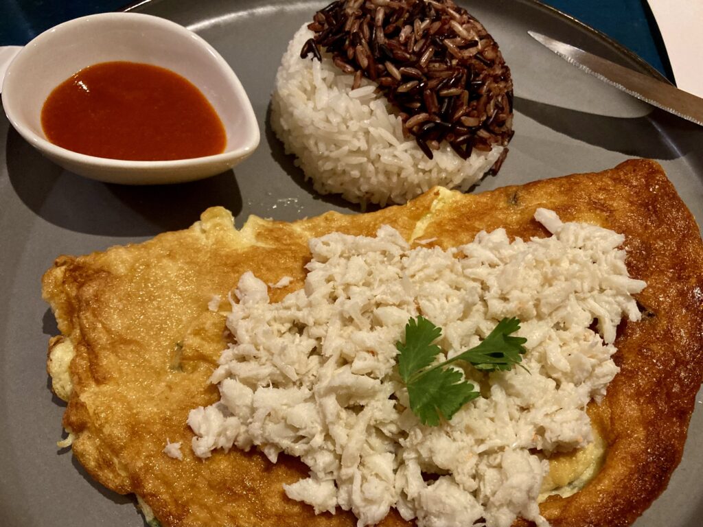 I might have been a bit overwhelmed with my choices, but I had studied the menu online the previous evening, and I came into Thai House with my mind made up: Khai Jian Poo with Jasmine Rice (Thai Crab Omelet), which the breakfast menu described as “Golden, crispy, Thai-style omelet with lump crab meat, topped with green onion and cilantro. Served with Jasmine rice.” After some reflection, my wife went with her breakfast default: eggs benedict. In the case of Thai House, however, it was Tom Yum Eggs Benedict: “Perfectly poached eggs on a toasted English muffin, layered with smoked salmon and topped with a creamy, tangy Tom Yum hollandaise and fresh dill. A bold Thai twist on the classic brunch favorite.” And indeed it was.