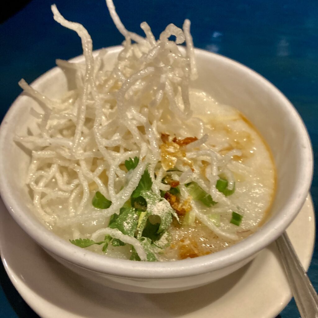 Out of the goodness of her heart, Jessie treated us to a complimentary Thai Rice Porridge, which the menu describes as “Creamy Thai-style rice porridge served with your choice of chicken or shrimp, topped with fresh ginger, crispy noodles, cilantro and green onions. A comforting and flavorful start to your day — the ultimate Thai breakfast classic.” How do you say no to that?