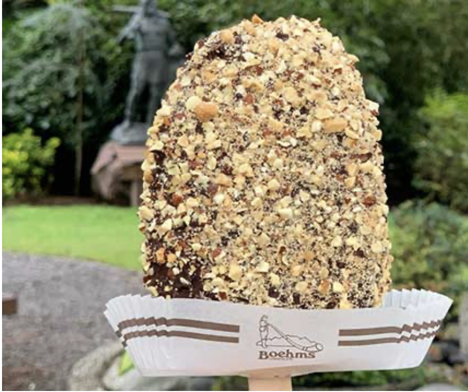 Such is the case with a Boehms Bar. Yes, deconstructed it comes down to just three components: a generous portion of vanilla ice cream on a wooden stick, covered in dark chocolate and encrusted with a mixture of toffee and nuts. But if you’ve ever experienced one, I don’t need to tell you that the result is ever so much greater than the sum of its parts. You already know what I’m talking about.