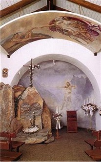Shortly before his death at age 83, Julius’ vision of a shrine to mountain climbers was completed. Next to the Boehm’s retail store and manufacturing plant, a replica of a 12th century chapel in Switzerland was built. The interior of the chapel features a recreation of Michelangelo’s Creation of Man suspended from the ceiling. Behind it, a mural portraying a fallen mountaineer being raised into the mists by a Christ figure merges with an altar of stone.